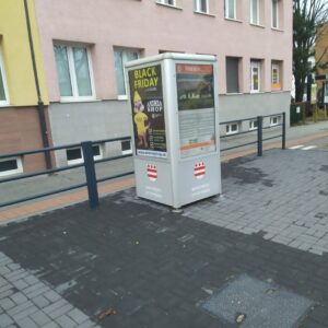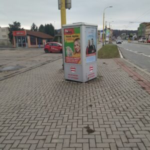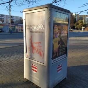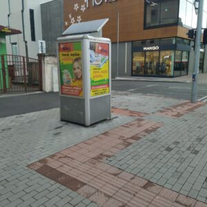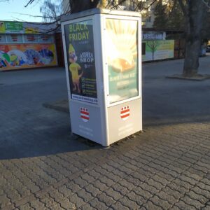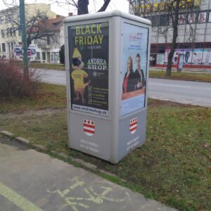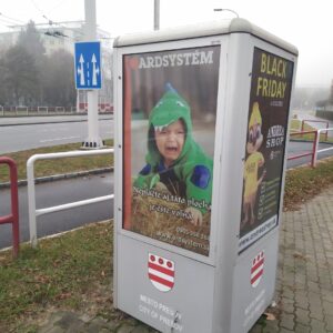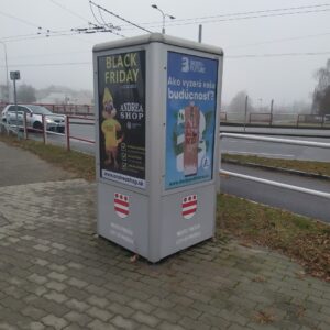 Ďalší reklamný 4-boký hranol, pri nákupnom stredisku Centrum na Sídlisku III, podľa zmluvy „informačné zariadenie“, na ktorom sa nenachádza ani jedna plocha pre mesto na v zmluve uvedený účel – propagácia cestovného ruchu, historických objektov, kultúrnych pamiatok, kultúrnych podujatí. Navyše toto „informačné zariadenie“ s jedným zo symbolov mesta – erbom na svojich štyroch stenách je nevhodne „umením podkuté“ – grafitom. Nie deň, ani týždeň.