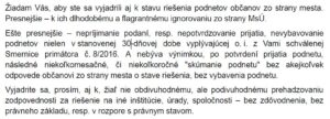 - jeden z mojich špeciálne pre primátorku a prednostu vybraných 25 podnetov sa týkal aj dodržiavania všeobecne záväzných právnych, konkrétne súladu konania MsÚ s Rozhodnutím Najvyššieho súdu SR č. 5 Tdo 32/2012. Podľa Najvyššieho súdu: „Pod pojmom bez zbytočného odkladu (bezodkladne) treba rozumieť v lehote spravidla pár dní (max. 5 – 7 dní), no určite nie mesiac“.